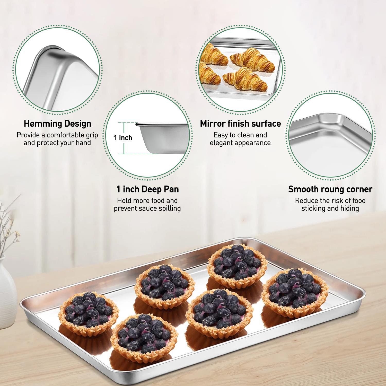 Our stainless steel baking tray is made of high quality mirror polishing process, the surface is smooth and flat, which can effectively reduce the risk of food sticking to the food, make the food easier to come off, and make it easier to clean. The edges of the baking pan are finely polished for a soft touch and a more comfortable grip, which not only enhances the experience of using it, but also ensures a smoother baking process.
