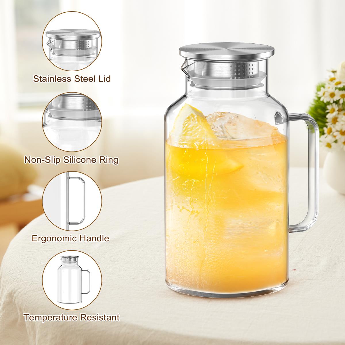 • 【Dual-Purpose Stainless Steel Filter Lid】 - The water pitcher features an innovative 304 stainless steel lid with dual-access functionality. Its precision micro-mesh filters herbs and seeds flawlessly, while the wide-mouth design enables smooth juice pouring. Through extensive engineering, we've reinforced the lid with heavy-duty steel construction for shake-resistant performance and lasting reliability.
