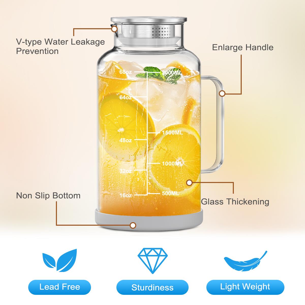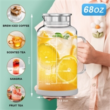 Meet your new hydration essential: GPED 68 oz Glass Water Pitcher. Crafted from durable borosilicate glass, it effortlessly handles hot coffee and iced tea alike. Track your intake with its clear measurement lines, enjoy drip-free pouring thanks to the secure lid and spout, and rest easy with its non-slip silicone base. Elegant, practical, and built for daily use—it’s the smart and stylish way to serve any beverage.