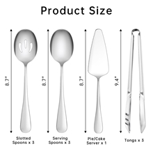 【10-piece Serving Utensil Set】-You'll get the 10 pieces serving utensils for buffet, including: 3 × 8.7" serving spoons, 3 × 8.7" serving slotted spoons, 3 × 9.4" serving tongs, and 1 × 8.7" pie/cake server.