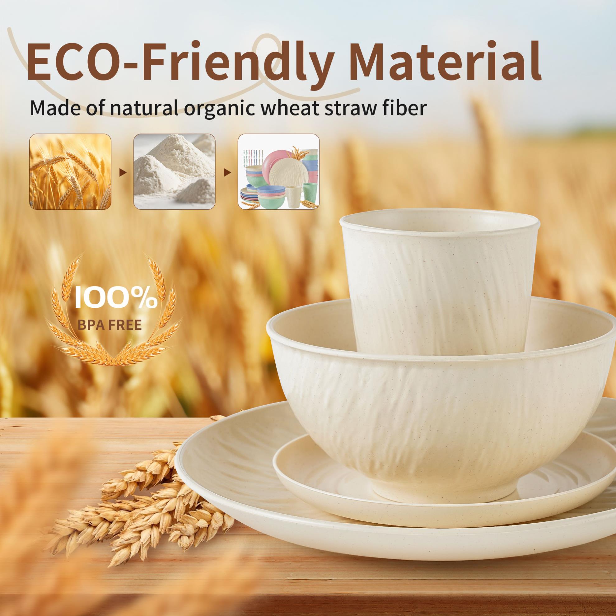 【Eco-Friendly & Sustainable Material】-The dinnerware set is natural degradable wheat straw fiber and food grade PP material, this lightweight dinnerware set is 100% BPA free, gluten-free, non-toxic, odorless and environmentally friendly, it can directly contact with food, sustainable to environment for your home.