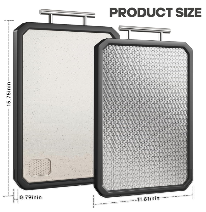 Revolutionize your kitchen prep! This double-sided cutting board features durable 304 stainless steel on one side for meats and a smooth wheat straw PP (BPA-free) side for veggies/fruits. Food-grade safe, reversible, and incredibly easy to clean. Gentle o