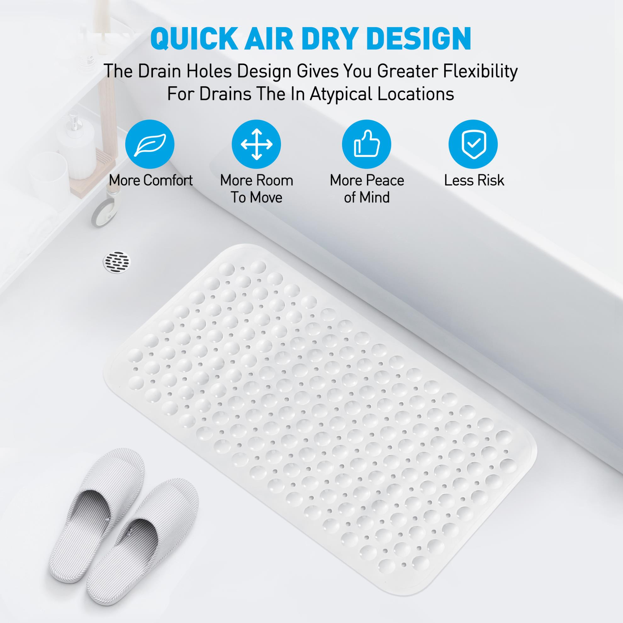 Non-Slip Extra-Large Bath Mat Our premium bath and shower mat measures 28x15 inches, offering maximum coverage—30% longer than standard mats, so no part of your tub stays exposed. Equipped with 200 specially designed large suction cups, it grips tightly t