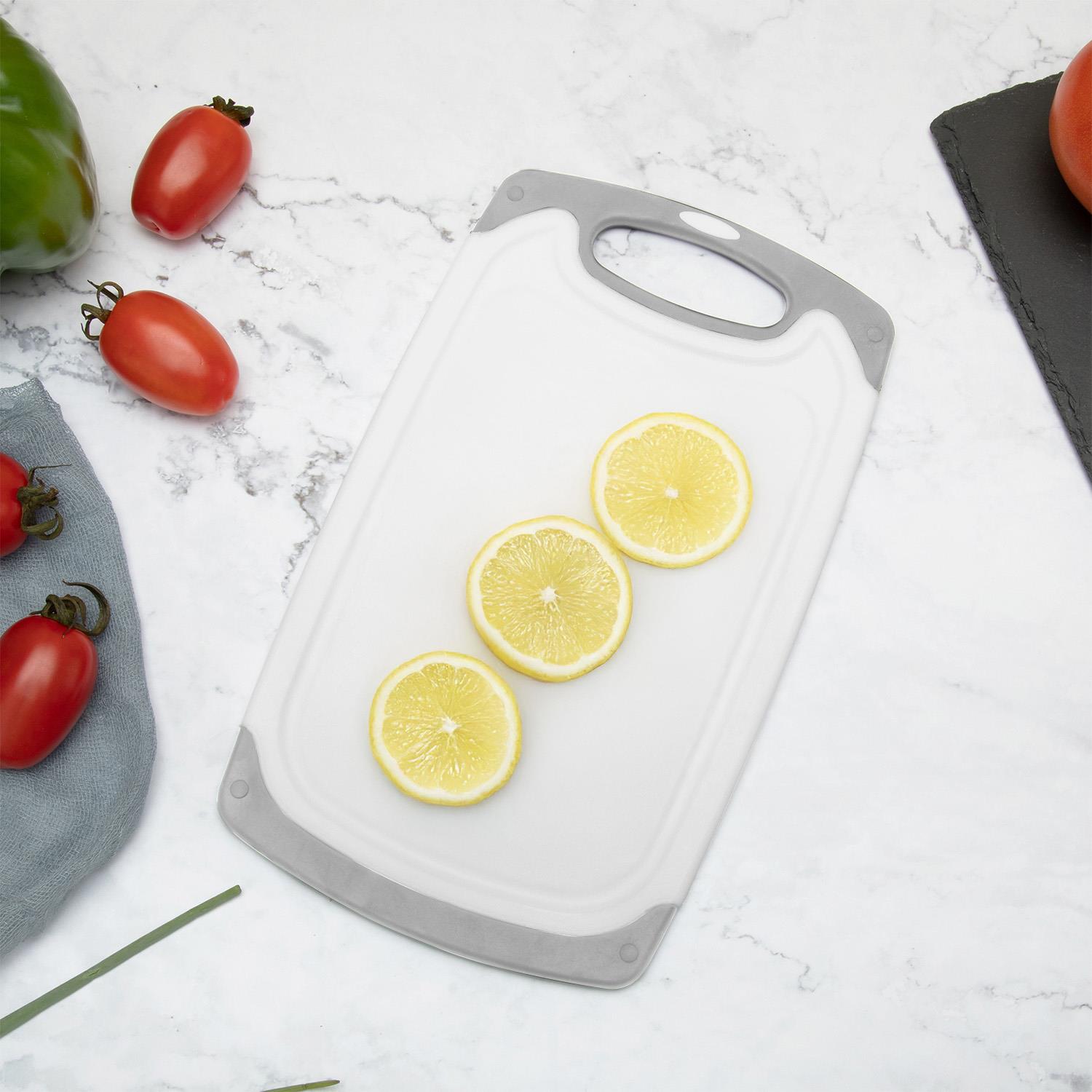 Upgrade your kitchen with this 3-piece plastic cutting board set. Designed for durability, each board resists knife scars and includes non-slip feet and juice grooves to contain messes. The different sizes help prevent cross-contamination. Dishwasher safe