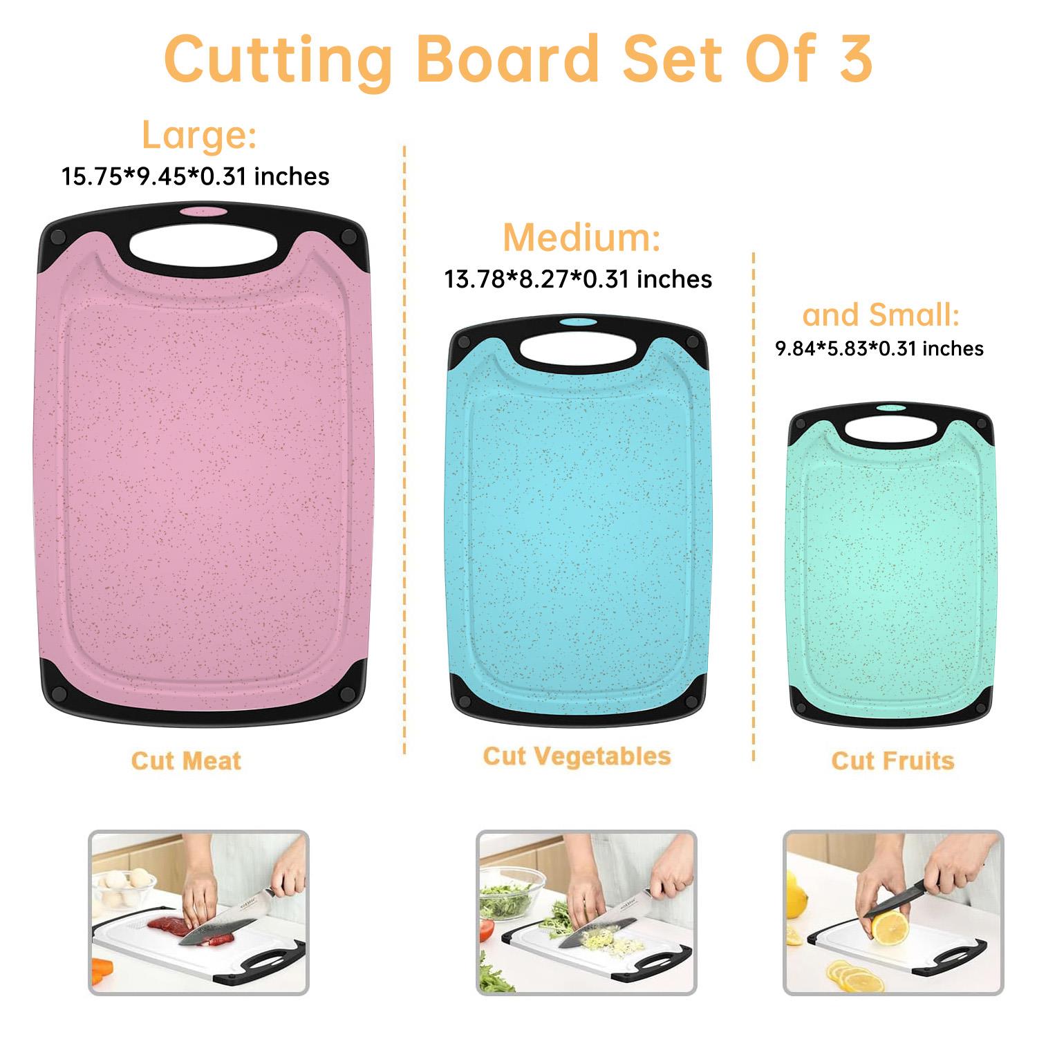 Upgrade your kitchen with this 3-piece plastic cutting board set. Designed for durability, each board resists knife scars and includes non-slip feet and juice grooves to contain messes. The different sizes help prevent cross-contamination. Dishwasher safe