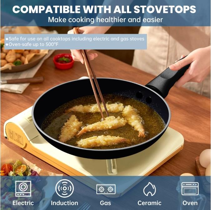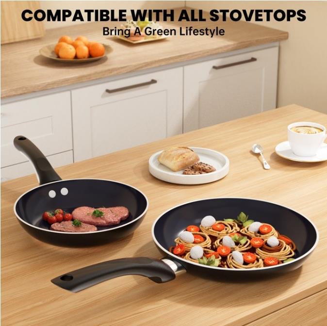 Ideal for All Kinds of Cooking: Our non-stick skillet pans are the flawless companion for family-style dinners and virtually any cooking occasion. Whether you're crafting sunny-side-up eggs, sautéing a medley of vegetables, frying eggs, flipping pancakes and omelets, or searing juicy steaks and grilling mouthwatering burgers, nonstick cookware skillet effortlessly tackles all your culinary adventures with ease and precision.
