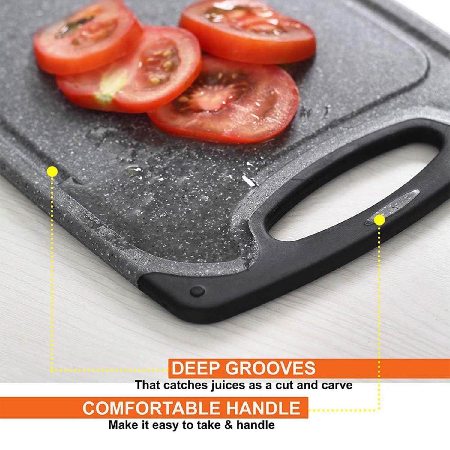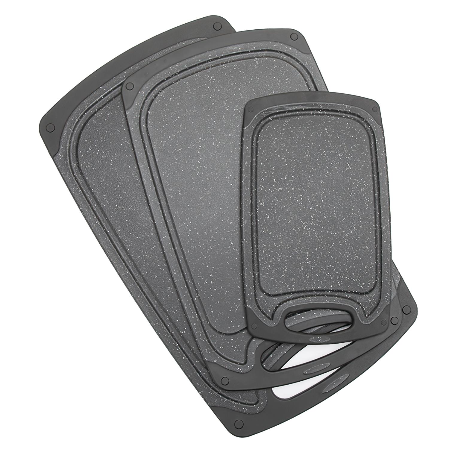 Upgrade your kitchen with this 3-piece plastic cutting board set. Designed for durability, each board resists knife scars and includes non-slip feet and juice grooves to contain messes. The different sizes help prevent cross-contamination. Dishwasher safe