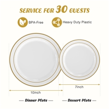 【30 Guests Value Pack】-Serves 30 guests.The white and gold plastic rim plates set include 30 large 10.25-inch dinner plates and 30 small 7.5-inch dessert plates, ideal for presenting delectable desserts, cakes, and appetizers.