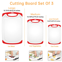 Upgrade your kitchen with this 3-piece plastic cutting board set. Designed for durability, each board resists knife scars and includes non-slip feet and juice grooves to contain messes. The different sizes help prevent cross-contamination. Dishwasher safe