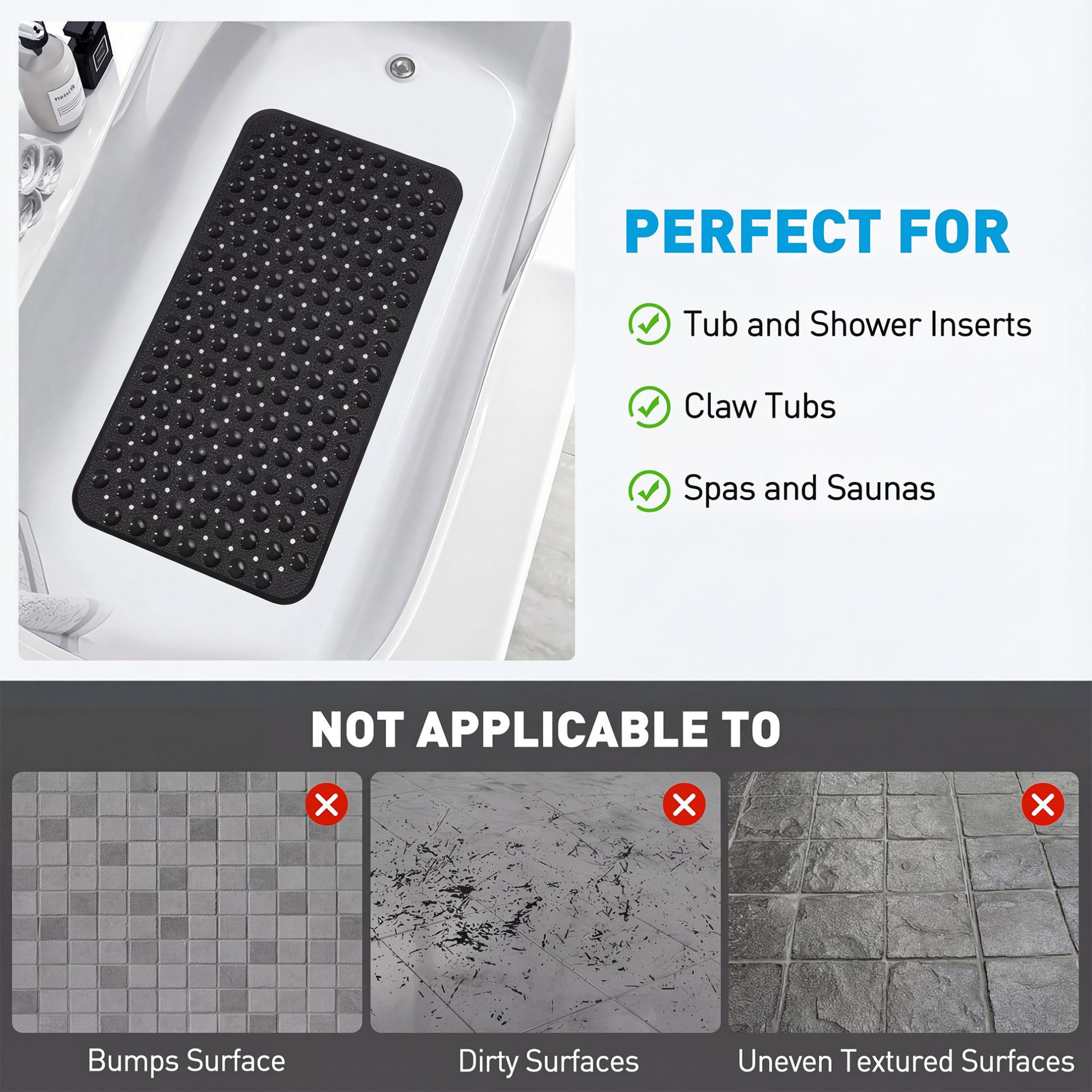 Hundreds of Suction Cups:Our high-quality bath and shower mats feature 200 large suction cups designed for optimal grip, outperforming mats with smaller cups. For optimal adhesion, we suggest firmly pressing the mat with your feet before use to ensure i