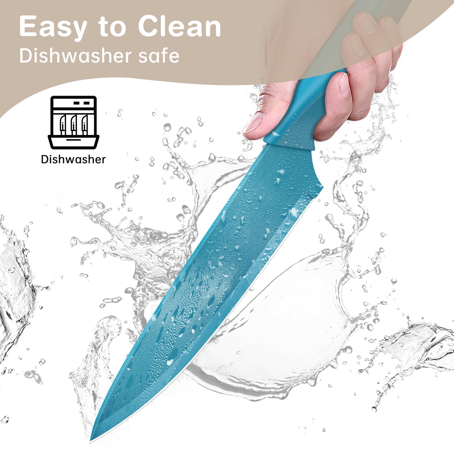 Knives are forgedorged with high-carbon stainless steel and manually polished to keep the sharp edge. Sharper cutting face with more acute 15-degree angles. Stainless steel kitchen knife set with cover ensures that the blade will not bend or break after the use for a long time.