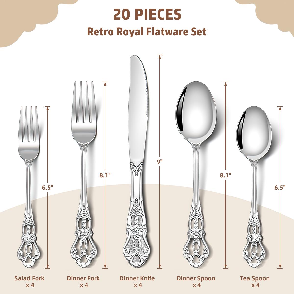 【20 Piece Vintage Silverware Set】-Flatware set includes 4 Dinner Forks, 4 Dinner Spoons, 4 Dinner Knives, 4 Tea Spoons, and 4 Salad Forks which is enough for 5 different place settings. Enhance your dining experience and allow you to enjoy the complete s…