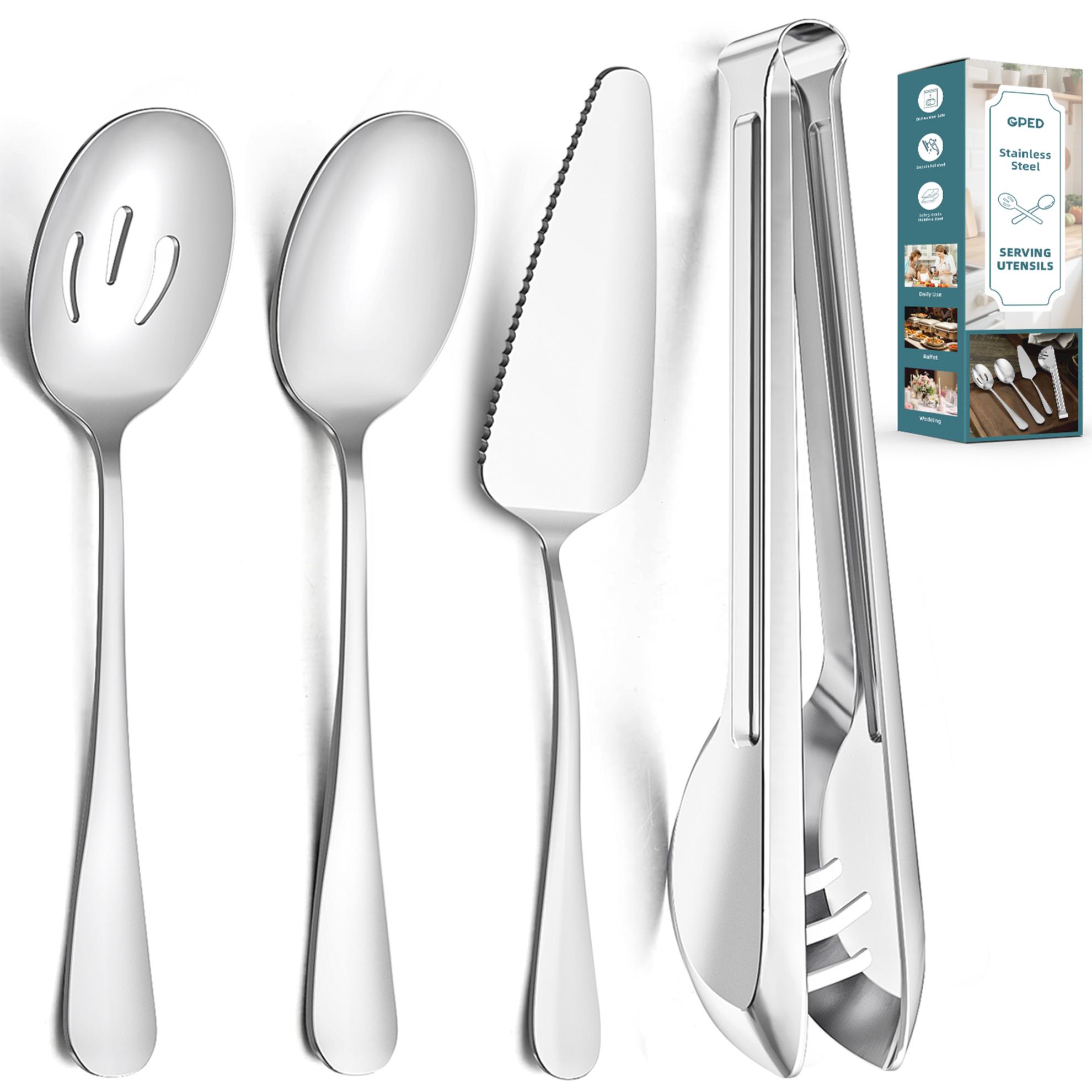 【Multiple Applications】-This versatile serving utensils set meets all your dining needs, whether for soups, buffets, cold dishes, or desserts. The tongs securely grip bread, grilled meats, and fish; the spoons scoop soups or mix salads; the slotted spoons drain liquids from foods; and the pie server effortlessly handles steaks, lasagna, cakes, pizza, and pies.