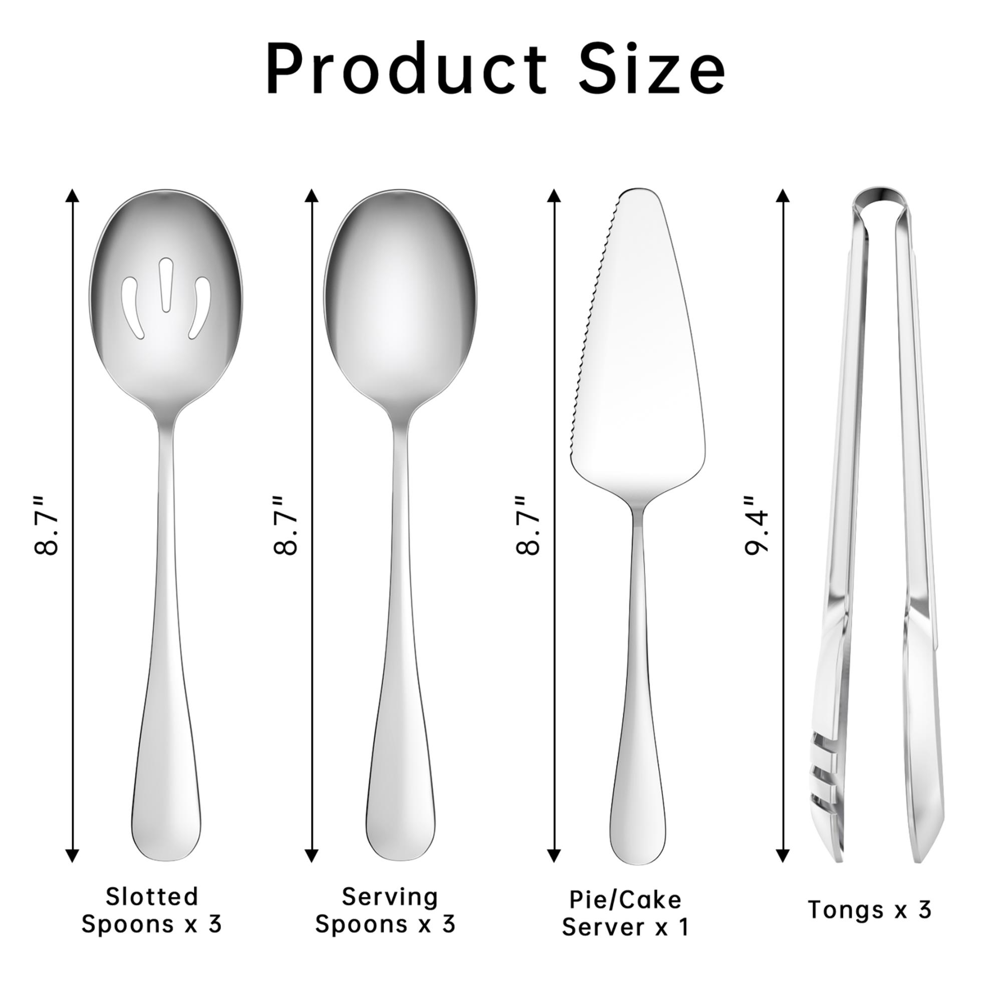【10-piece Serving Utensil Set】-You'll get the 10 pieces serving utensils for buffet, including: 3 × 8.7" serving spoons, 3 × 8.7" serving slotted spoons, 3 × 9.4" serving tongs, and 1 × 8.7" pie/cake server.