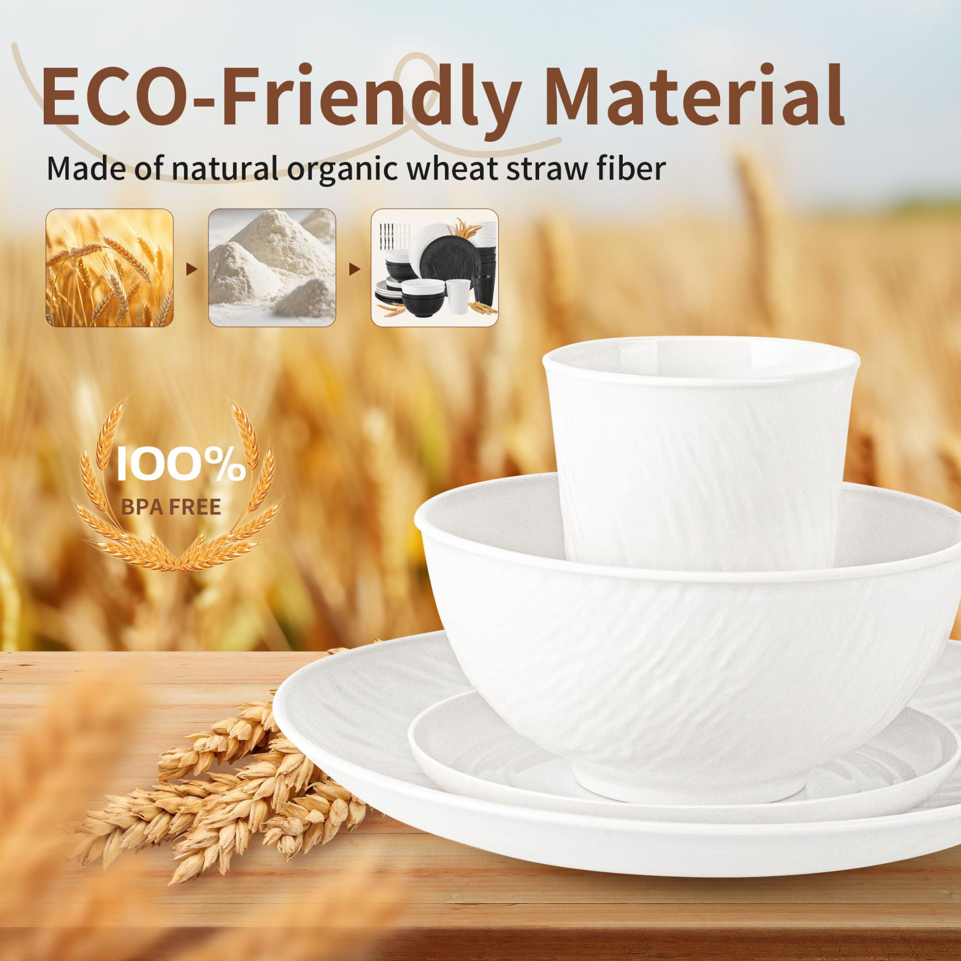 【Eco-Friendly & Sustainable Material】-The dinnerware set is natural degradable wheat straw fiber and food grade PP material, this lightweight dinnerware set is 100% BPA free, gluten-free, non-toxic, odorless and environmentally friendly, it can directly contact with food, sustainable to environment for your home.
