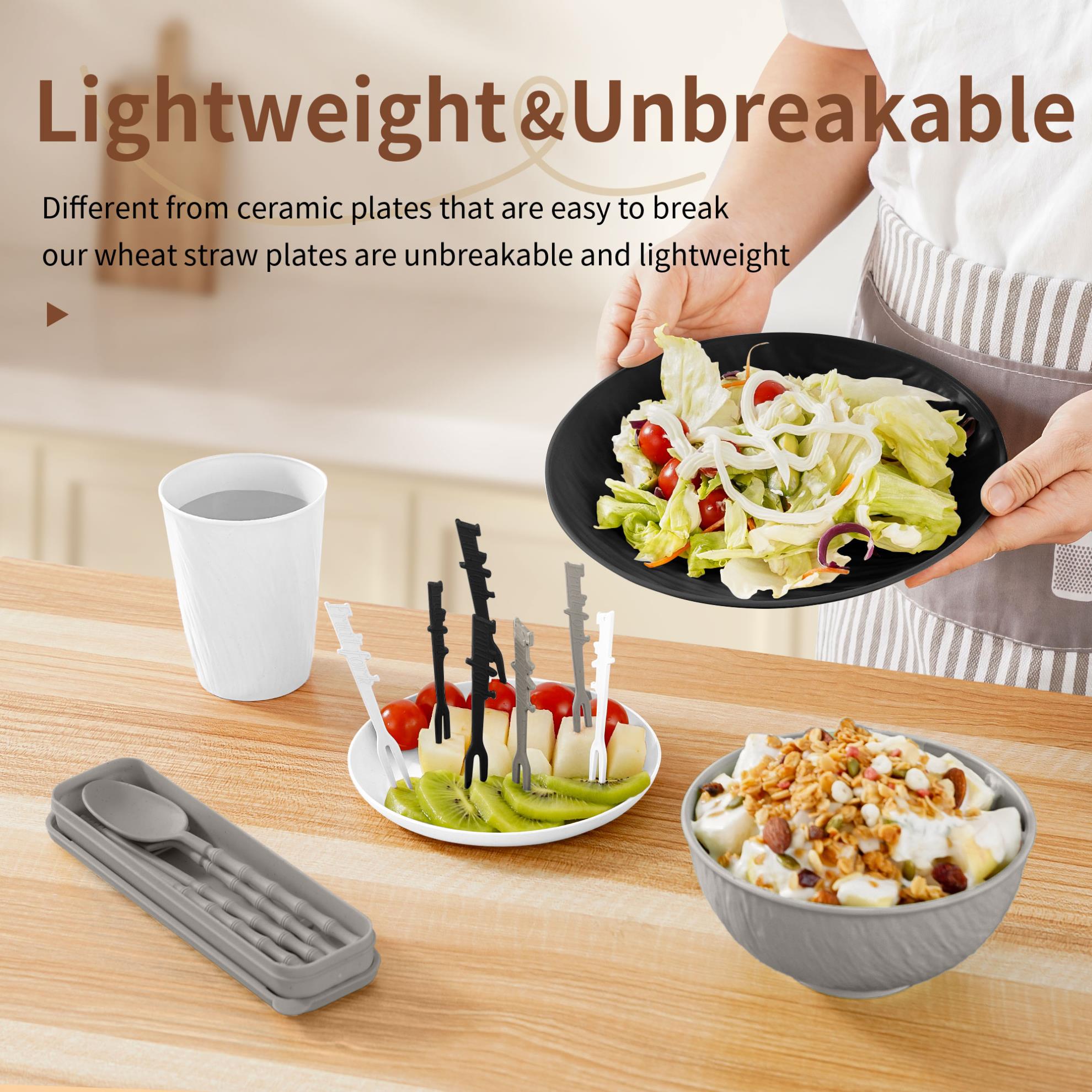 【Eco-Friendly & Sustainable Material】-The dinnerware set is natural degradable wheat straw fiber and food grade PP material, this lightweight dinnerware set is 100% BPA free, gluten-free, non-toxic, odorless and environmentally friendly, it can directly contact with food, sustainable to environment for your home.