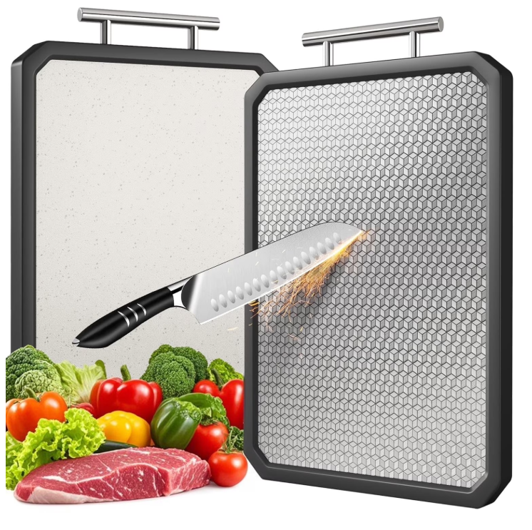 Revolutionize your kitchen prep! This double-sided cutting board features durable 304 stainless steel on one side for meats and a smooth wheat straw PP (BPA-free) side for veggies/fruits. Food-grade safe, reversible, and incredibly easy to clean. Gentle o