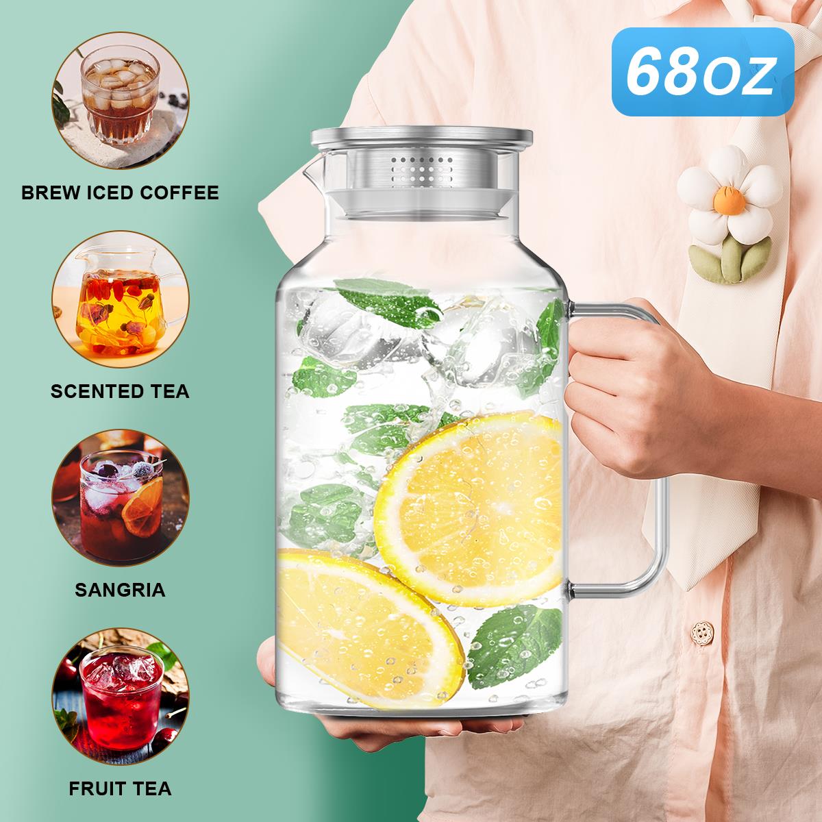 • 【Generous 60oz Serving Capacity】 - Perfect for entertaining, our glass jugs comfortably hold 60 ounces plus generous ice or fruit additions. With an 9" height and thoughtfully designed 4" opening width, they're ideal for crafting large quantities of iced tea, sangria, infused waters or cold brew while conveniently fitting standard fridge shelves.