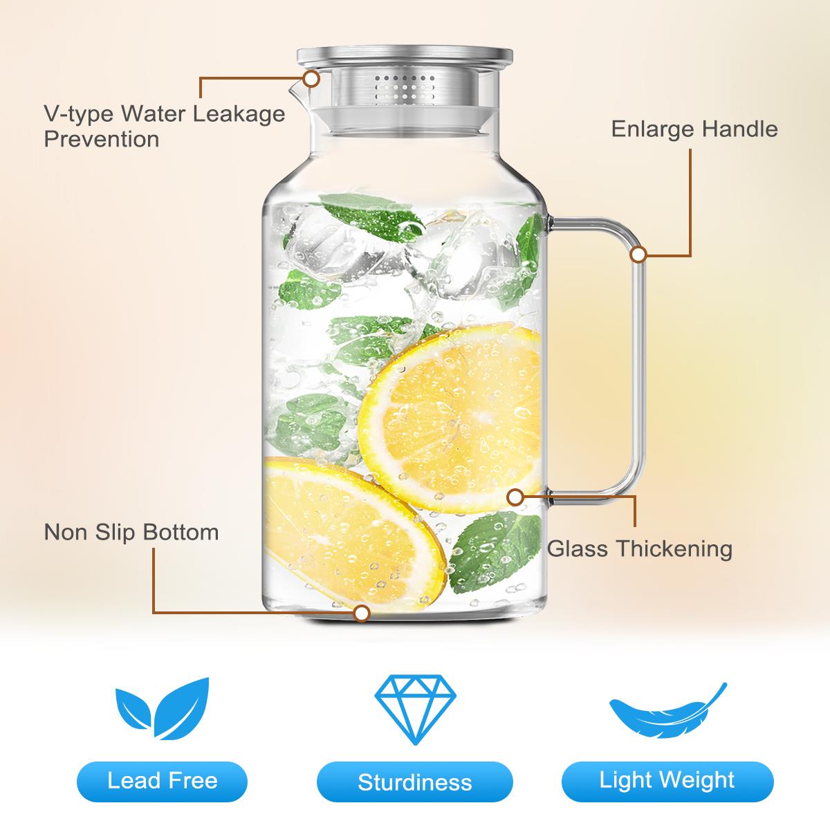 • 【Dual-Purpose Stainless Steel Filter Lid】 - The water pitcher features an innovative 304 stainless steel lid with dual-access functionality. Its precision micro-mesh filters herbs and seeds flawlessly, while the wide-mouth design enables smooth juice pouring. Through extensive engineering, we've reinforced the lid with heavy-duty steel construction for shake-resistant performance and lasting reliability.