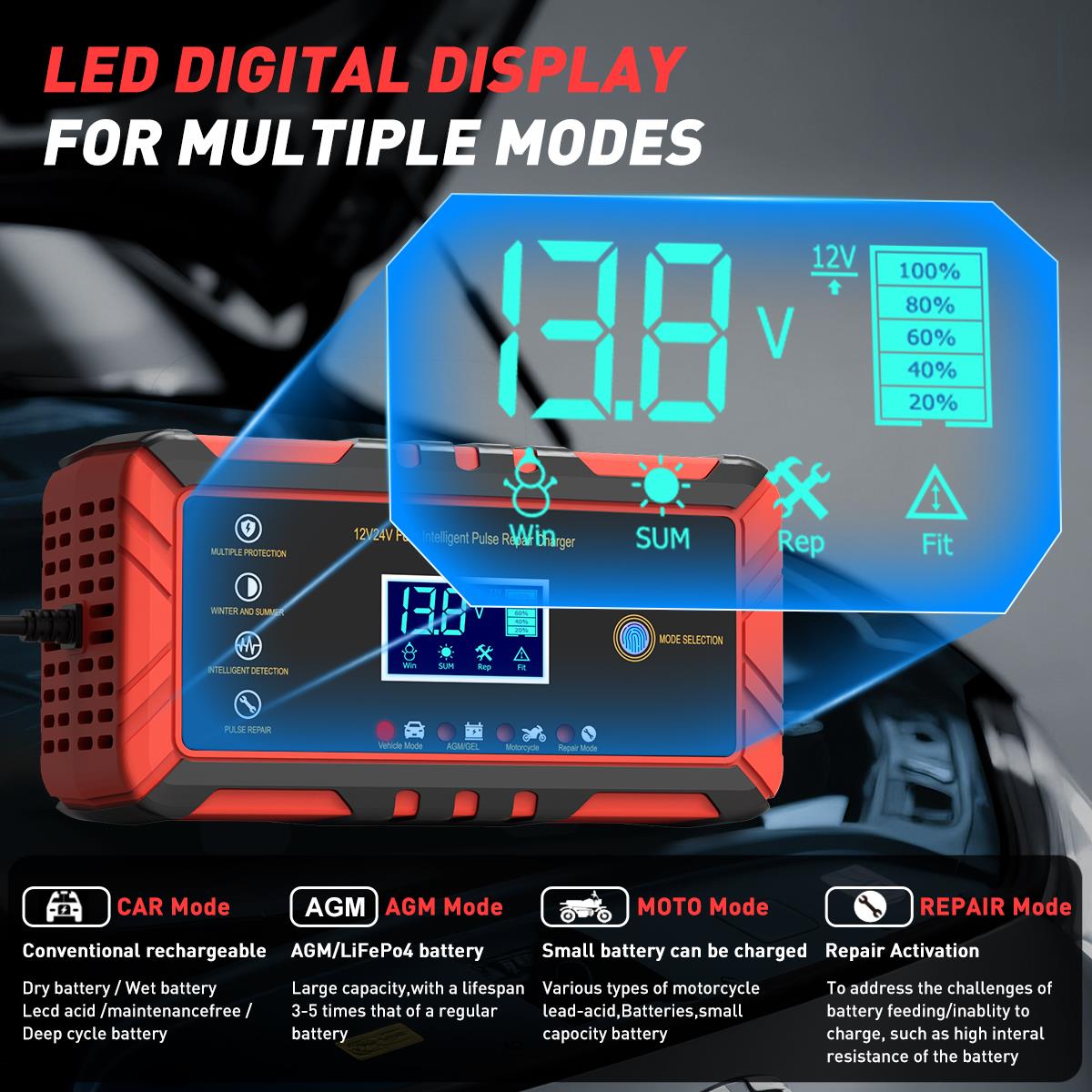 【Float/Trickle Charge】 Switch to float/trickle charge mode to maintain batteries over the winter: 1, Choosing corresponding modes(STD/AGM,GEL/WET/MOTORCYCLE) to fully charge the battery, screen display "FUL" 2, Then switch to "MOTORCYCLE&q…