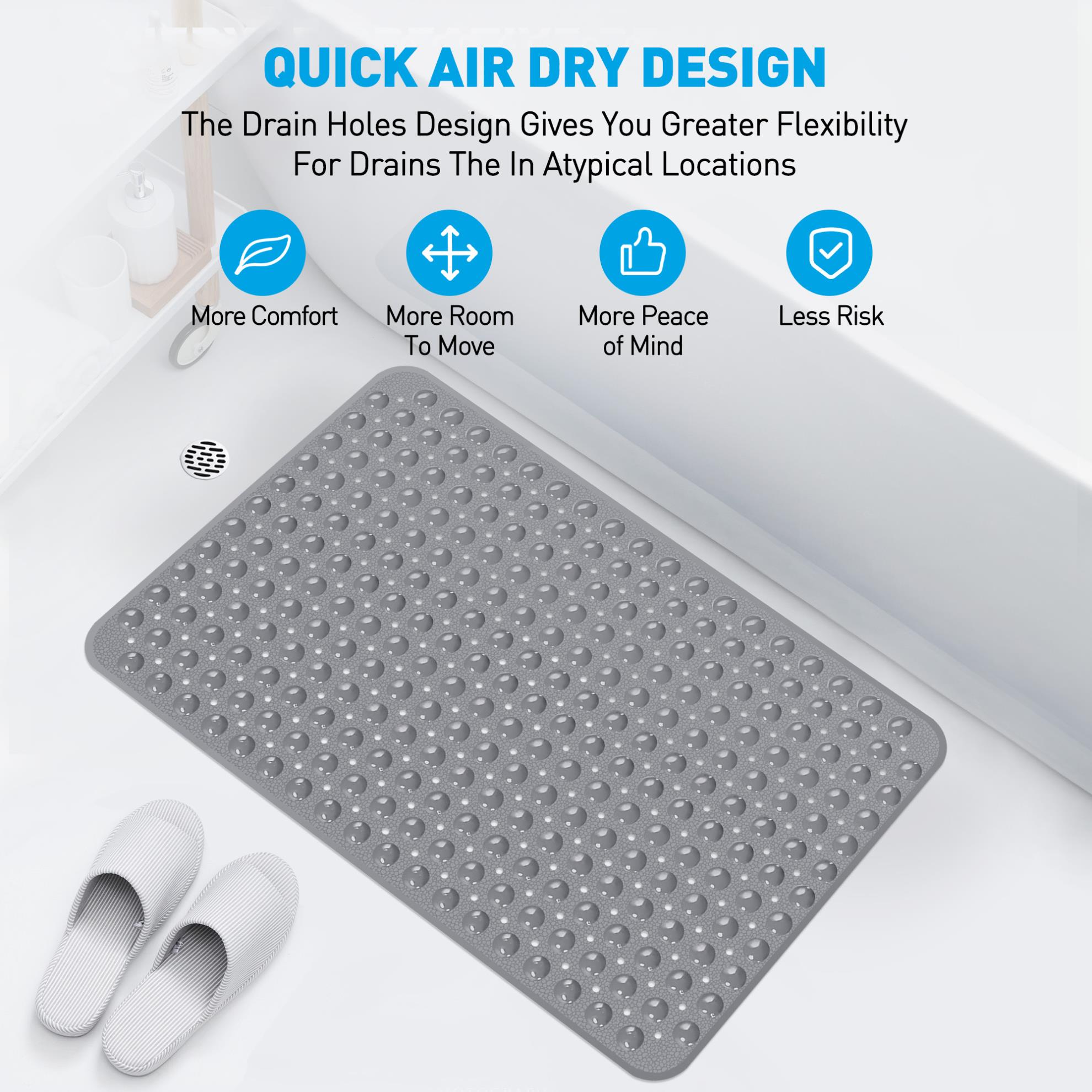Non slip bathtub mat are crafted from high-quality, soft-touch PVC that's both sturdy and gentle on bare skin. Rest easy knowing it's free from BPA, latex, and phthalates, ensuring both safety and lasting durability. Note: For optimal grip performance, use only on clean, smooth surfaces; it is not suitable for textured, tiled, or uneven tubs.