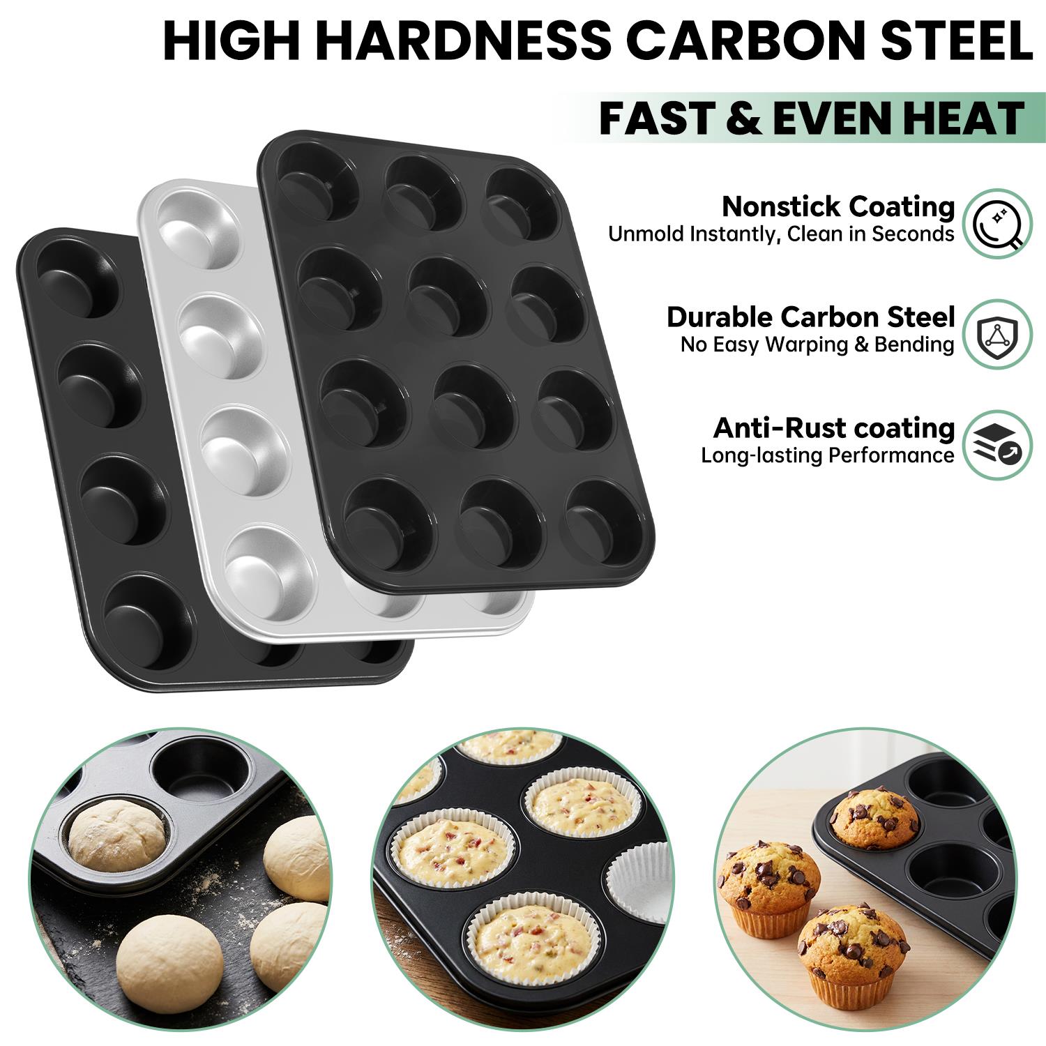 • 【Professional-Grade Material】Crafted from quality carbon steel, these GPED muffin tins promote even heat circulation and tolerate temperatures up to 450°F, helping achieve consistently baked goods with uniform coloring.