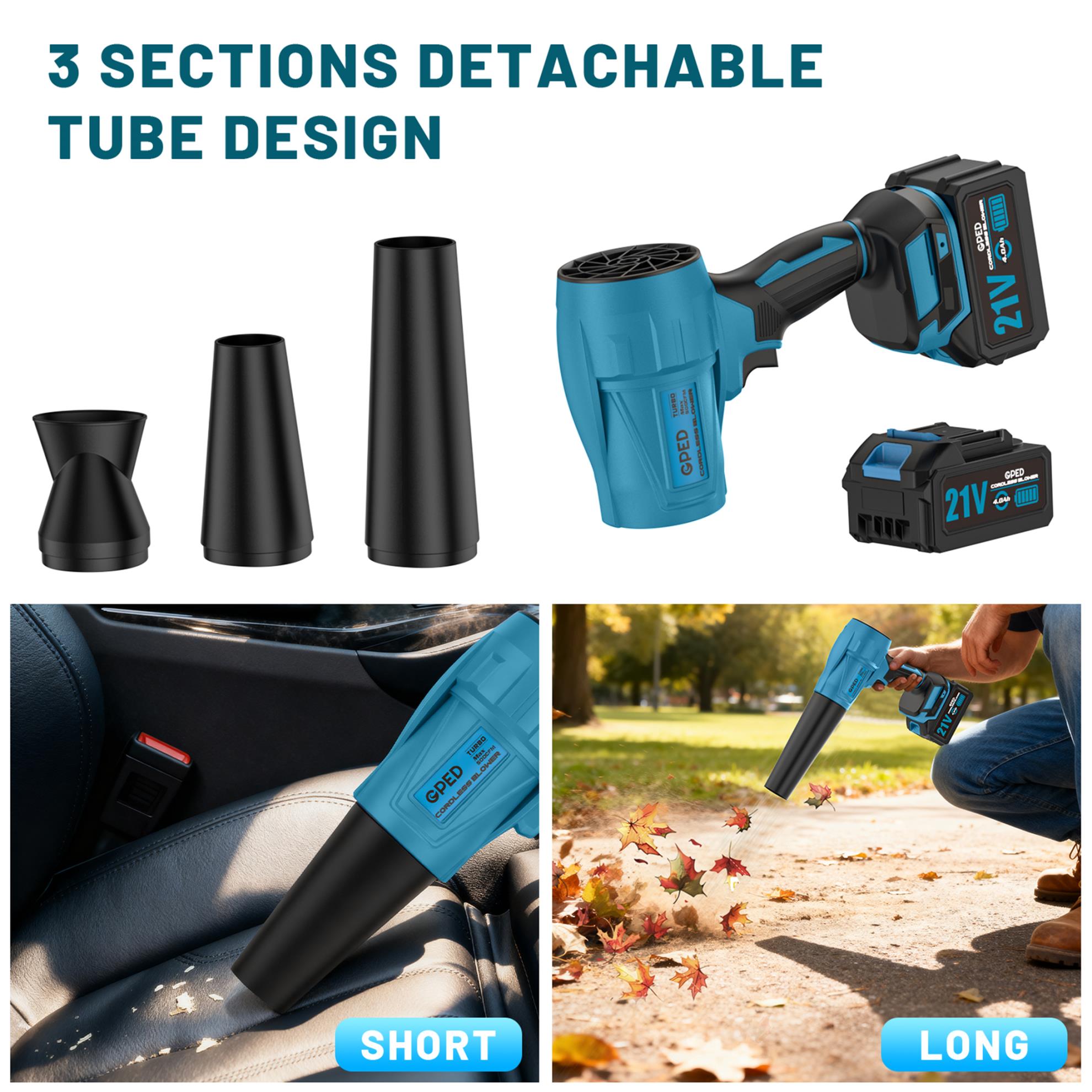 【Versatility – From Yard to Workshop】-The GPED blower isn’t just for leaves—it’s your ultimate year-round cleanup tool! Effortlessly clear fallen leaves, patio dust, light snow, and shallow puddles around your home. Switch to turbo mode to conquer workshop messes—blast away sawdust, wood chips, and debris from workbenches, tools, and hard-to-reach corners with precision power.