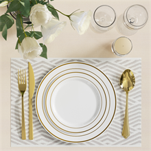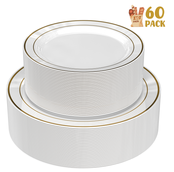 【30 Guests Value Pack】-Serves 30 guests.The white and gold plastic rim plates set include 30 large 10.25-inch dinner plates and 30 small 7.5-inch dessert plates, ideal for presenting delectable desserts, cakes, and appetizers.