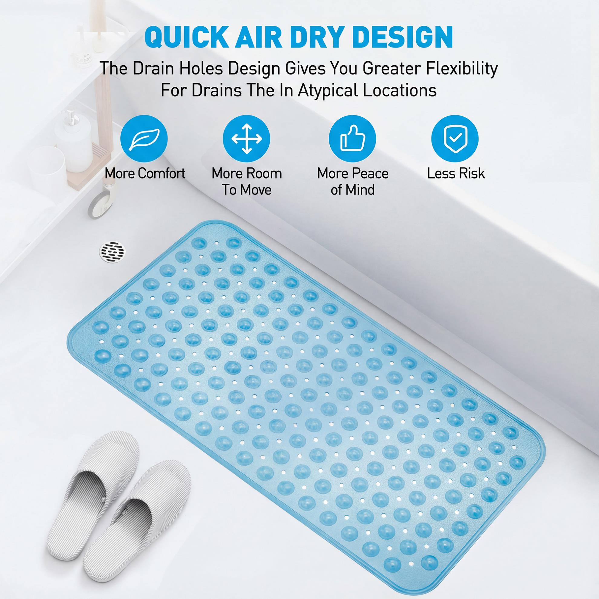 Slip-Proof Extended Bath Mat:Our premium bathtub and shower mats are engineered with 200 specially designed large suction cups. These oversized cups deliver far stronger adsorption power than standard small ones, locking securely onto smooth, clean surf