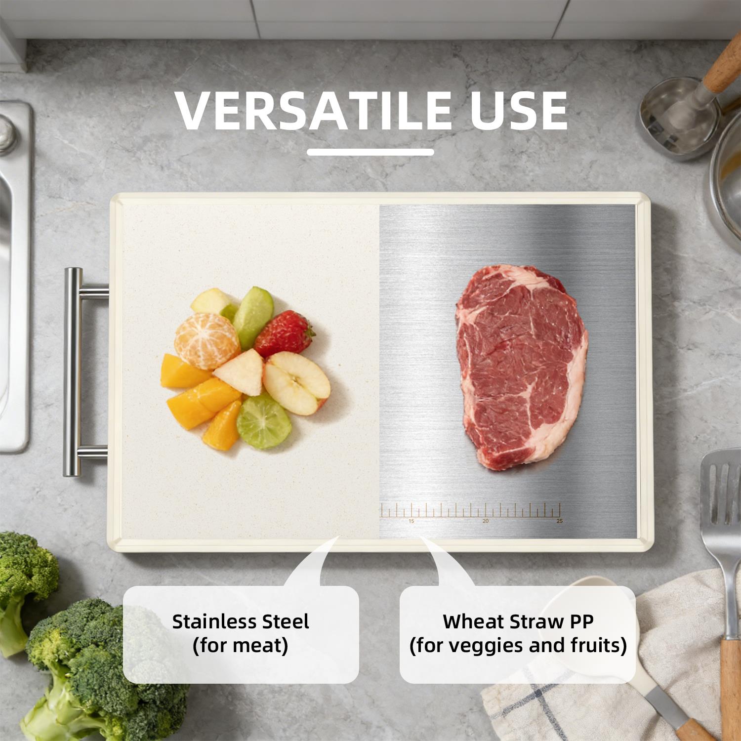 Revolutionize your kitchen prep! This double-sided cutting board features durable 304 stainless steel on one side for meats and a smooth wheat straw PP (BPA-free) side for veggies/fruits. Food-grade safe, reversible, and incredibly easy to clean. Gentle o