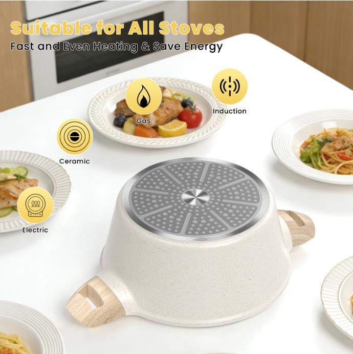 Compatible with All Stovetops The nonstick dutch oven is constructed from cast aluminum with stainless steel base to prevent from warping, wobbling, or degrading over time, heats fast and evenly. Suitable for all stovetops, including Induction cooktop.