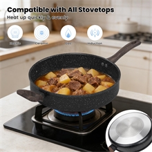 Heat Quickly and Evenly The enlarged induction base of our non stick frying pan facilitates quick and even heat distribution. No more waiting, as you'll achieve better cooking results in less time. It is safe for all stoves, including induction.