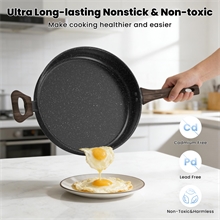 Superior Nonstick Performance Our nonstick frying pan with lid providing superior nonstick performance with non-toxic properties. Enjoy healthier cooking with less oil intake. Advanced technology ensures a long-lasting and naturally nonstick surface that effortlessly releases food.