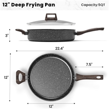 Versatile Saute Pan Our 12" diameter, 3" height, and 5 quarts capacity saute pan to meet various cooking needs, such as sautéing, poaching, braising, and deep frying. It is especially suitable for large families and can fulfill your everyday cooking requirements.
