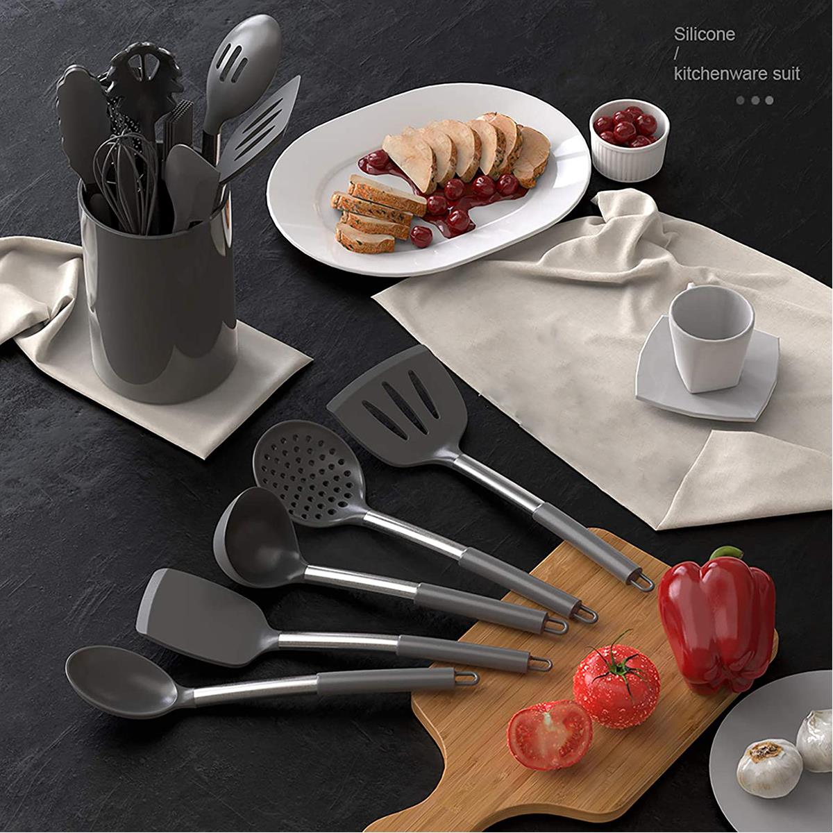 First, I love the color. The handles match my hammered silver cookware great. The cream color of the silicone goes well with my antique white cabinets. I just threw out the plastic storage crock it came with and used a ceramic crock I already had. The one that came with it is nothing special. They are sturdy too. They were well worth the money just to get the color I wanted.